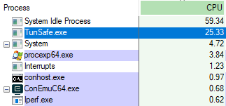This is a test with iperf using TunSafe 64-bit running on Windows 10 on an Intel Core i7-860 2.80GHz communicating over Gigabit Ethernet to a Linux server that uses the WireGuard kernel module.